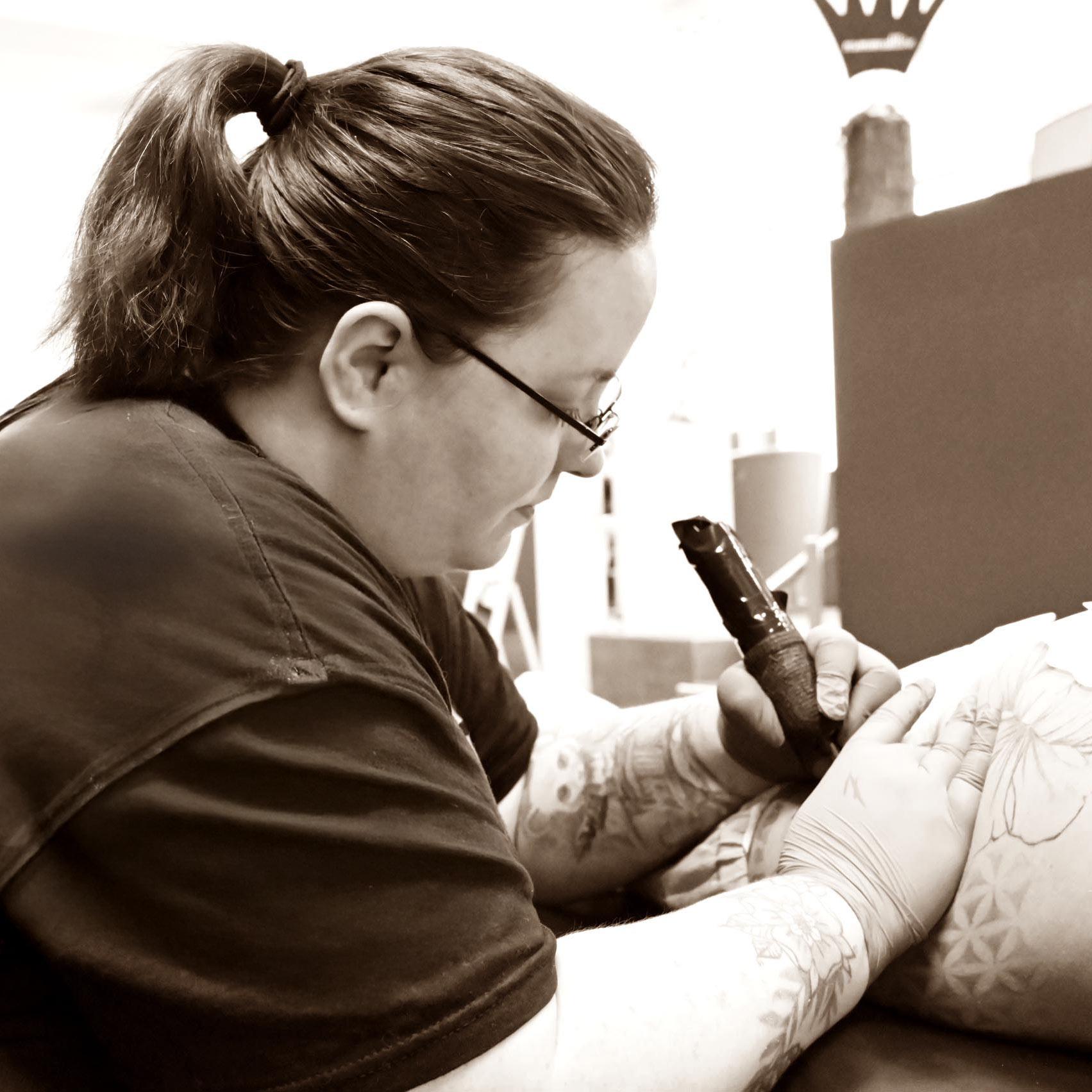 Durch Freunde die mich schon als Tätowiererin sahen, bevor ich es tat, fand ich den Weg ins Studio. Klar, interessiert war ich immer, doch selbst tätowieren? Schwer vorstellbar. Doch ich wagte es mich vorzustellen, als Petra einen neuen Azubi suchte und fühlte mich sofort wohl bei ihr und Dani. Die Ehrlichkeit für die Ausbildungszeit, das herzliche Miteinander und die Unterstützung auf allerlei Ebenen boten mir die Aussicht auf einen Arbeitsplatz, den ich so nirgendwo anders wieder haben würde und so begann mein Weg 2018 zur Tätowiererin, unter Petra’s Anleitung.